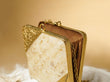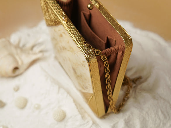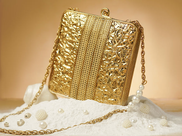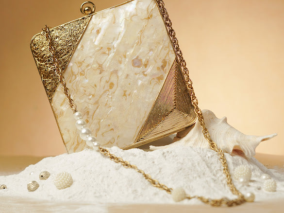This clutch is a radiant medley of golden textures—handcrafted with intricate mother of pearl embellishment, stones and metallic accents. Its structured silhouette is perfectly balanced with a delicate chain strap, making it a statement piece for festive nights, sangeets, or wedding receptions.