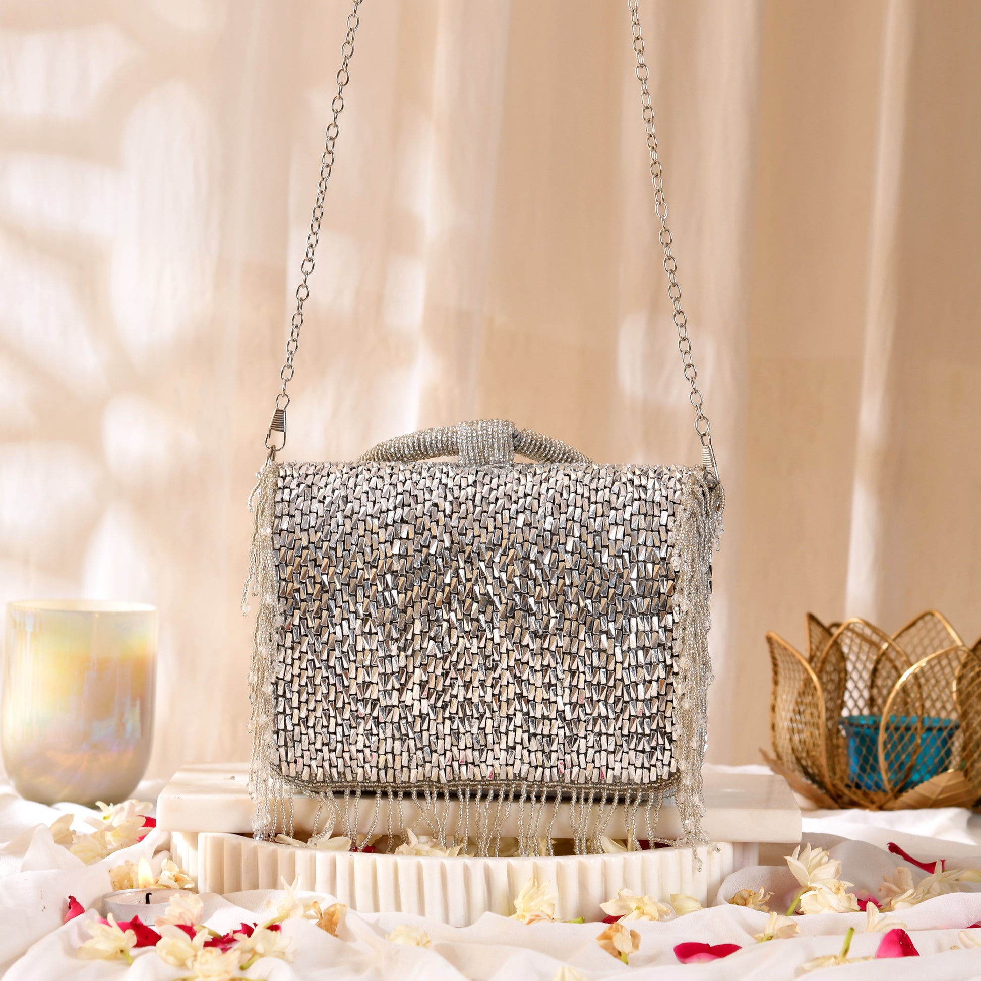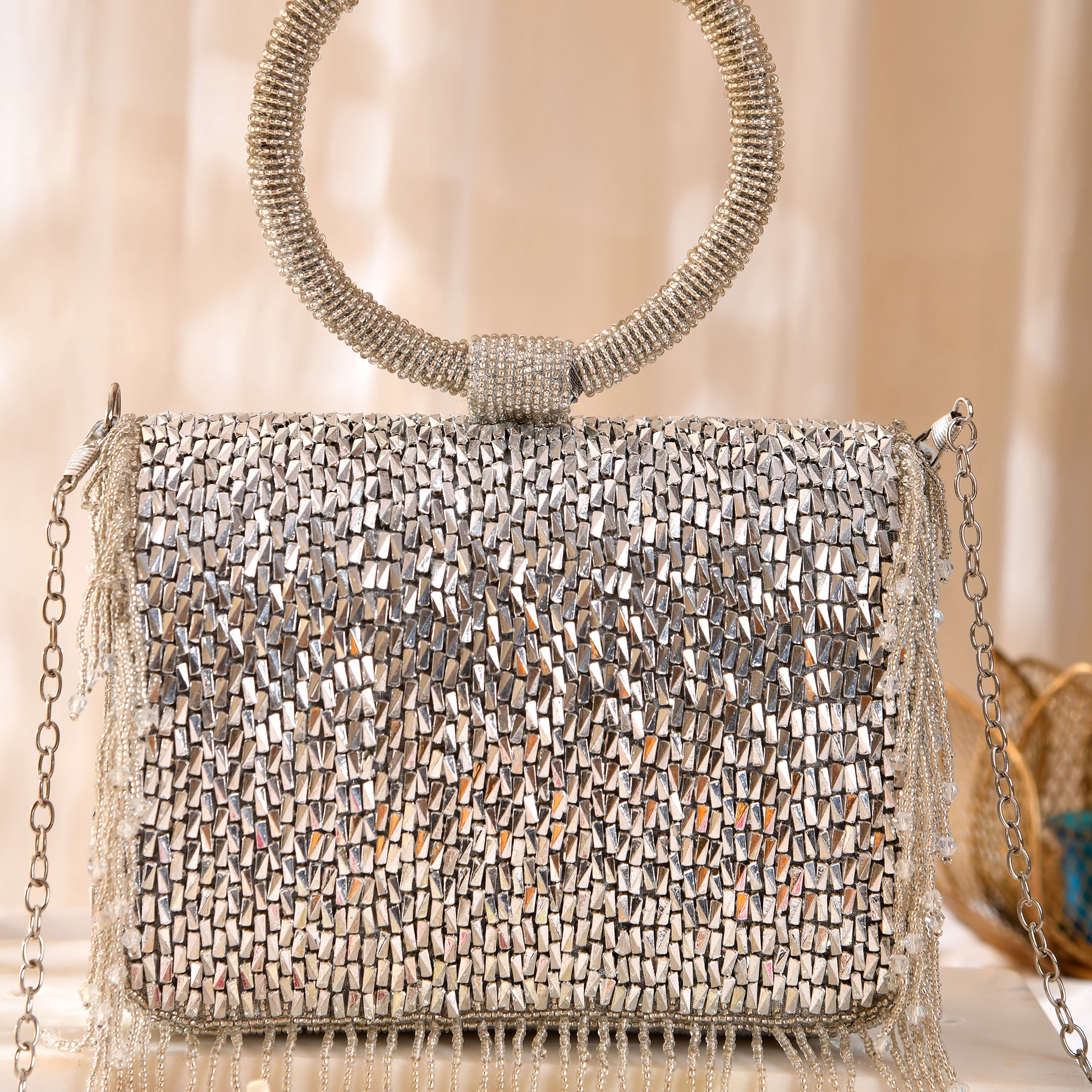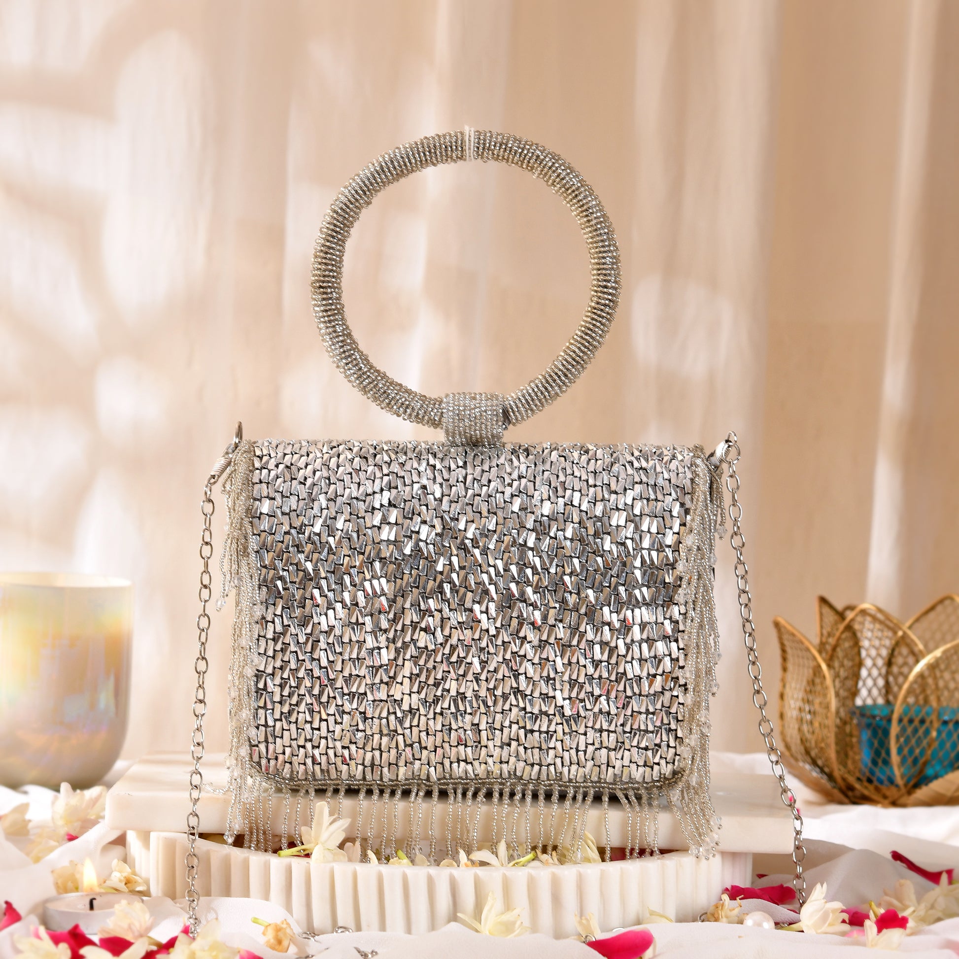 Turn heads with our handcrafted Golden Gleam Halo Bag, featuring luxe beadwork, a signature circular handle, and delicate fringe detailing. Perfect for weddings, festive nights, or any glam occasion—carry it handheld or crossbody for versatile elegance