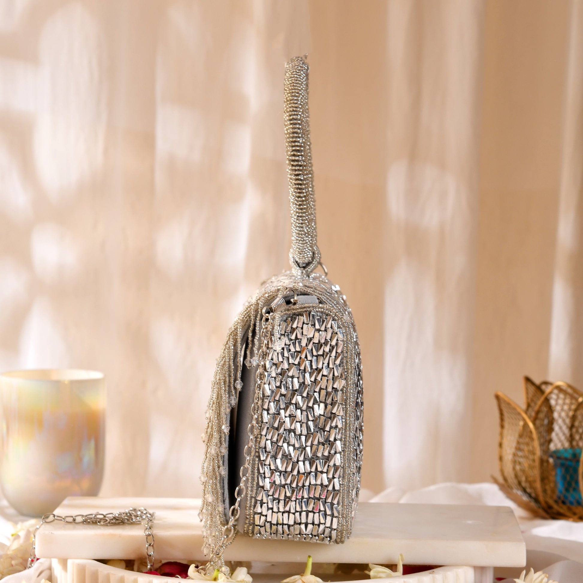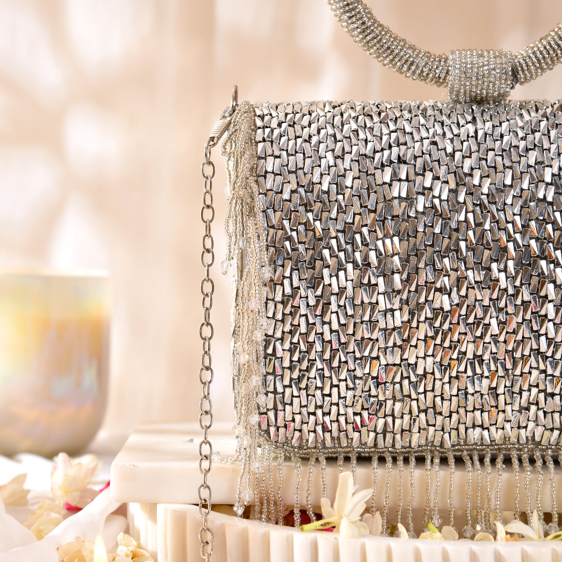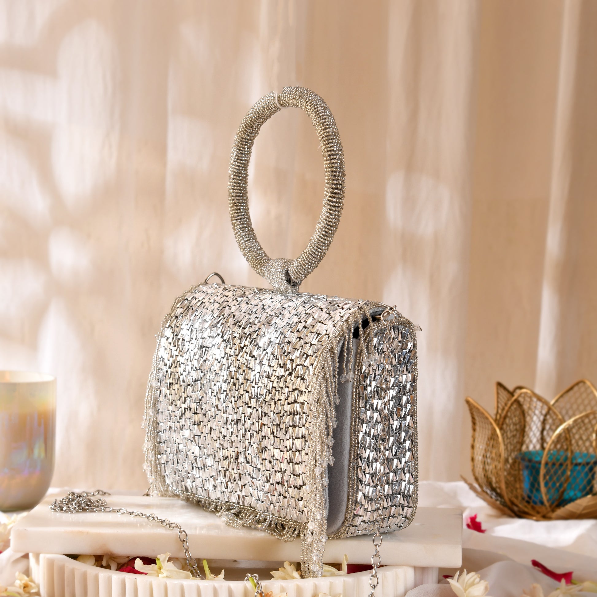 Turn heads with our handcrafted Golden Gleam Halo Bag, featuring luxe beadwork, a signature circular handle, and delicate fringe detailing. Perfect for weddings, festive nights, or any glam occasion—carry it handheld or crossbody for versatile elegance