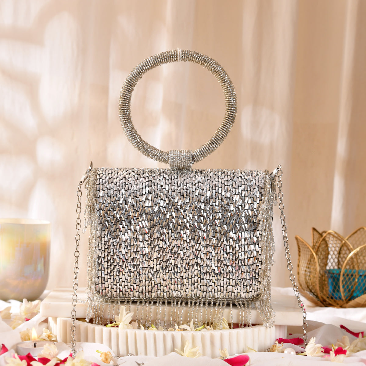 The Silver Zest Gleam Halo Bag is a handcrafted statement accessory designed to turn heads at every occasion. Featuring intricate beadwork, a signature circular handle, and delicate fringe detailing, this bag combines elegance with playful charm. Lightweight and versatile, it can be carried handheld or crossbody, making it perfect for weddings, festive nights, cocktail parties, or glamorous evening events. Pair it with sarees, lehengas, Indo-western, or contemporary outfits for a look that sparkles from every angle.