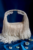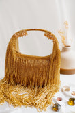 This dazzling Gold clutch is a harmony of shimmer and movement—featuring sleek hand-beaded fringe, a textured handle, and a graceful silhouette. Whether styled with an ethnic ensemble or a cocktail dress, it’s your go-to for when the invite says glamour required.