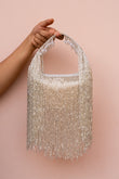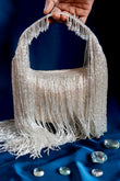 This dazzling silver clutch is a harmony of shimmer and movement—featuring sleek hand-beaded fringe, a textured handle, and a graceful silhouette. Whether styled with an ethnic ensemble or a cocktail dress, it’s your go-to for when the invite says glamour required.