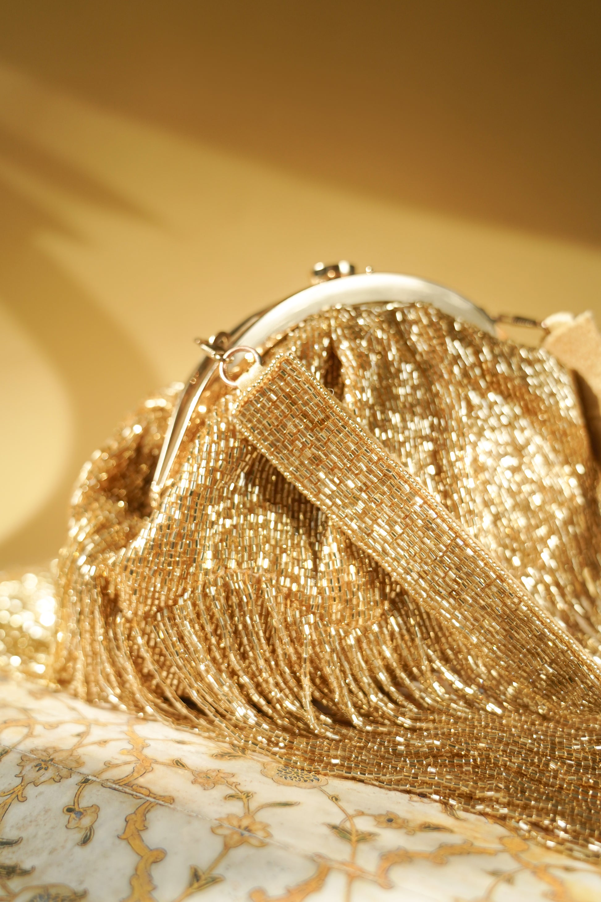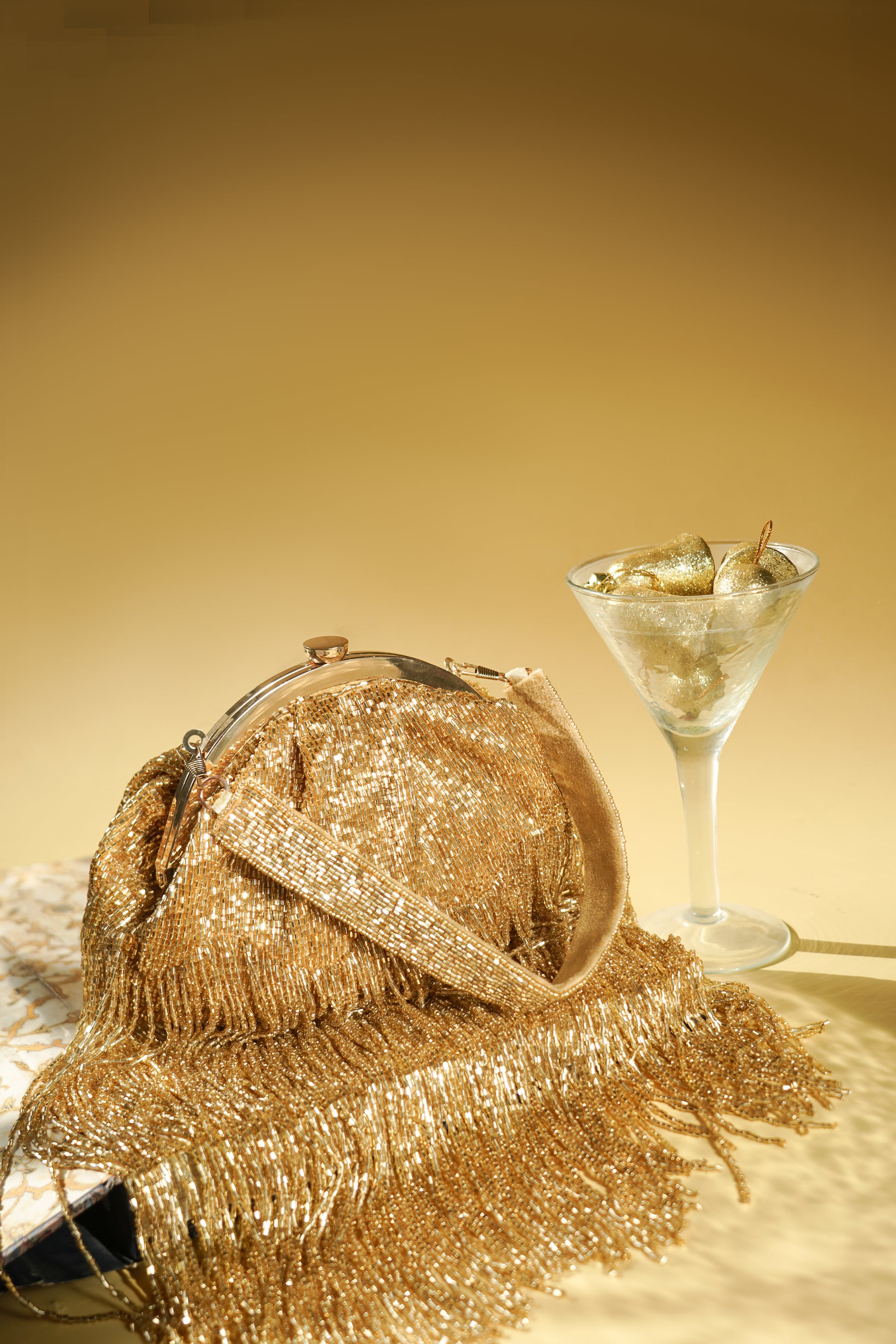 With its vintage kiss-lock closure and cascading gold fringe, this clutch channels timeless 1920s elegance with a fresh, high-shine twist. Perfect for receptions, cocktail nights, or when your outfit calls for unapologetic sparkle.