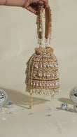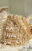 “A stunning pearl and gold potli, handcrafted with intricate beadwork and luxe detailing—perfect for adding elegance to any festive or bridal look.”