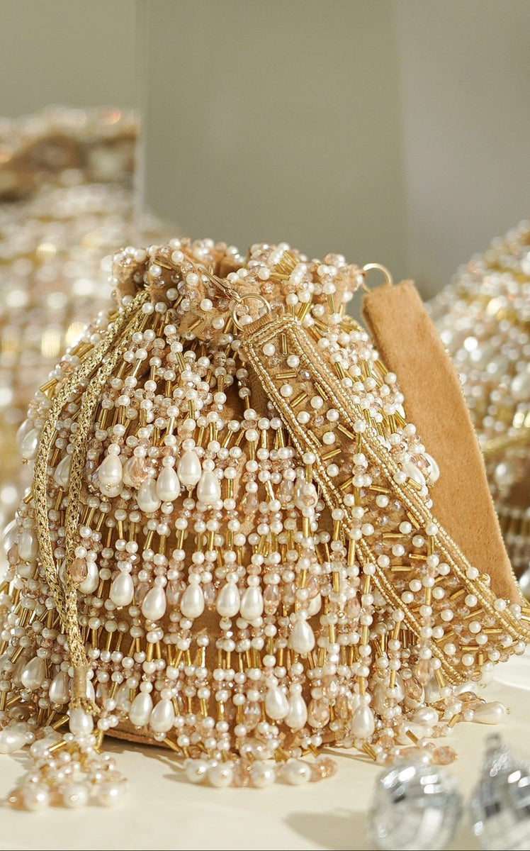 A stunning pearl and gold potli, handcrafted with intricate beadwork and luxe detailing—perfect for adding elegance to any festive or bridal look.