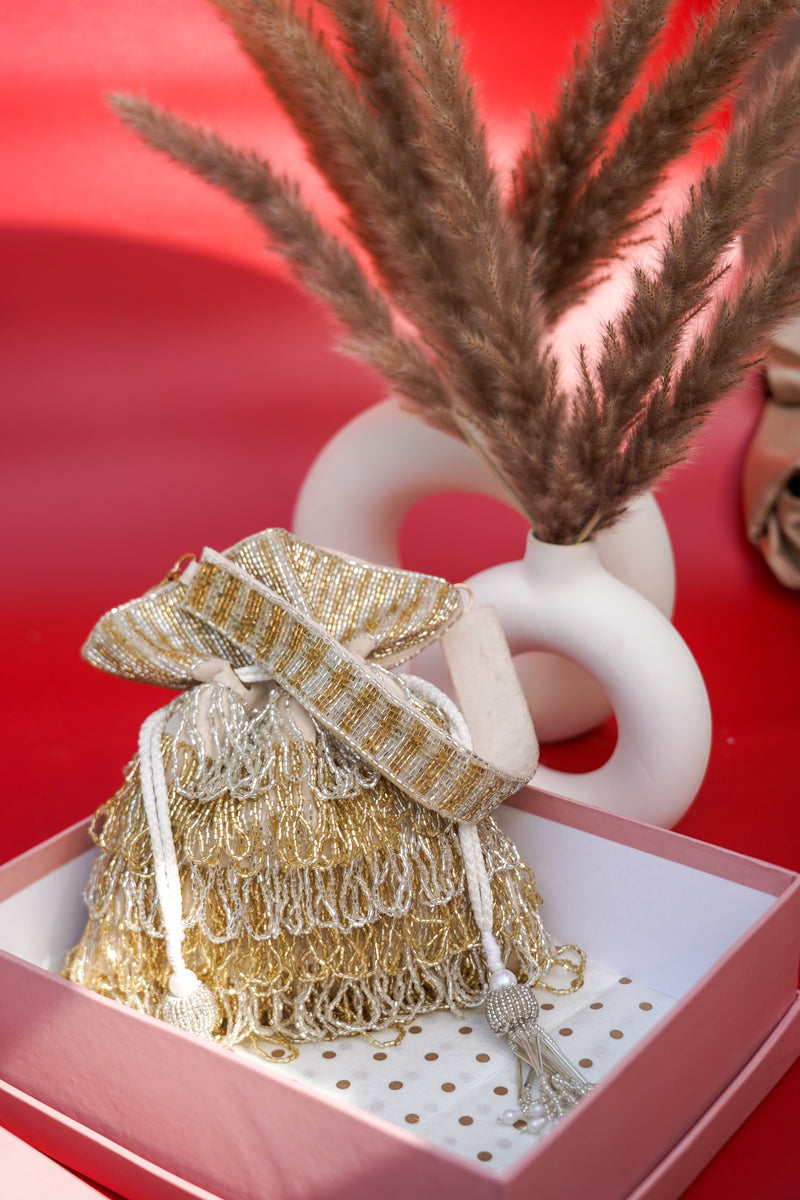 The Noor Fringe Potli is a playful nod to tradition with layers of gold and white fringe handwork. It shimmers with every step—perfect for bridesmaids, sangeet nights, or adding a bold accent to a minimal outfit.